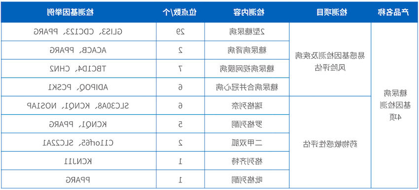并且通过对瑞格列奈、罗格列酮、二甲双胍、格列齐特、吡格列酮五种常见糖尿病治疗药物相关基因进行检测,提高药物的治疗效果,避免药物不良反应,为糖尿病疾病个性化用药提供指导。