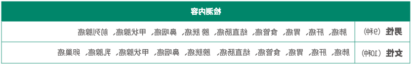 通过检测抑癌基因TP53上与肿瘤发生密切相关的易感位点,评估其对男性9种肿瘤(肺癌、肝癌、胃癌、食管癌、结直肠癌、膀胱癌、鼻咽癌、甲状腺癌、前列腺癌)、女性10种肿瘤(肺癌、肝癌、胃癌、食管癌、结直肠癌、 膀胱癌、鼻咽癌、甲状腺癌、乳腺癌、卵巢癌 )的发生风险的影响,帮助受检客户针对发生风险增加的肿瘤进行早期预防,包括调整生活方式、进行针对性体检等,以规避导致疾病发生的危险因素。