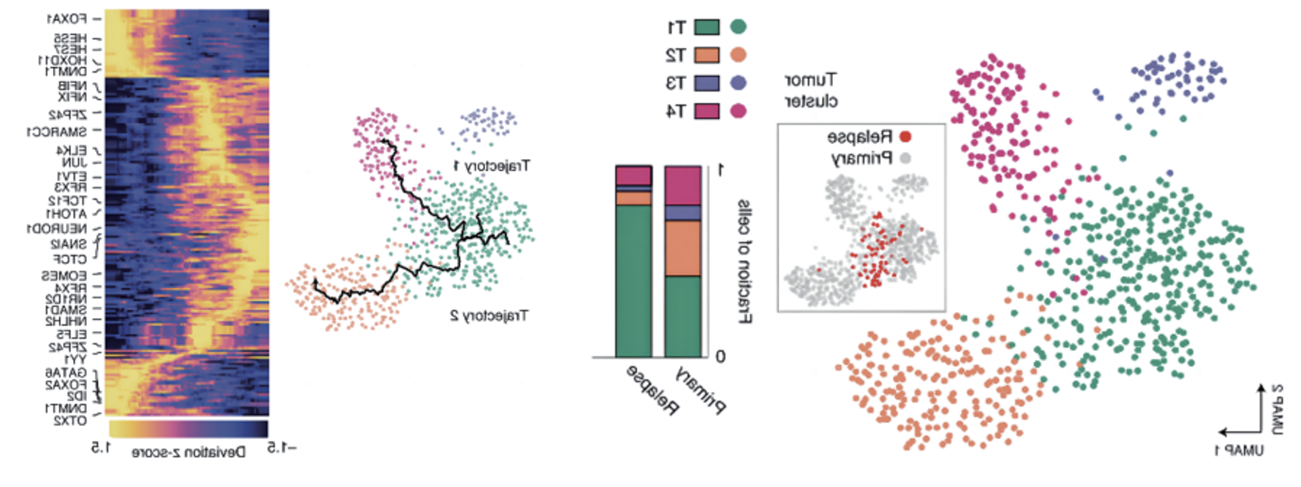数据表明样本共分为4类细胞亚群,其中复发肿瘤细胞T1亚群占比最高,该群细胞H3K27me3的信号弱并且细胞干性相关的基因活跃,具有向其他细胞类群发育的潜力。